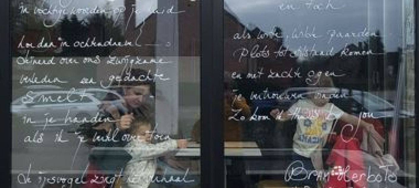 Onze Gedichtendag was een succes. Veel volk in de zaal en veel blije gezichten. De winnaars en eervolle vermeldingen kregen nog een extra prijs, want bibliotheekbediende Silvia Claes heeft hun gedichten op twaalf ramen geschreven. Kalligrafische pareltjes.
